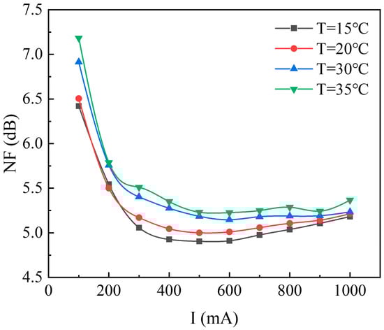 In the experiment, with the signal input power set at 6 dBm, the noise figure (NF) obtained through spectral analyzer testing is shown in Figure 16. The experimental results indicated that the NF of the SOA increases with temperature, attributed to the rise in spontaneous emission noise due to elevated temperature. At low driving currents, background noise remained inadequately suppressed, with NF primarily reflecting the SOA’s spontaneous emission noise. At a driving current of 0.1 A, NF exceeded 6.5 dB.