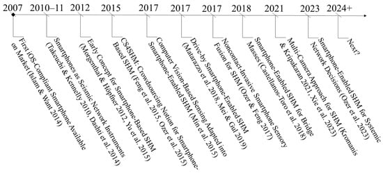 Before projecting a comprehensive review on different research tracks in smartphone-based bridge SHM, it is vital to express how the literature evolved within the last decade. The first iOS-compliant smartphone, iPhone, was released in 2007; see a history of smartphone industrial advances in [27]. Soon after, in the early 2010s, the first smartphone applications making use of embedded accelerometers for a geoscience purpose were introduced, such as iSeismometer [28] and iShake [29]. Embedded triaxial accelerometers in smartphones could function as seismometers and eventually form a dense seismic network [30]. Since seismometers sense the earth’s motion following seismic activity, the same principle could apply to other deformable or vibratory physical media, i.e., civil infrastructure. Accordingly, the core condition assessment discipline SHM was introduced to the smartphone sensing concept, where the first journal papers provided the early proof [31,32].