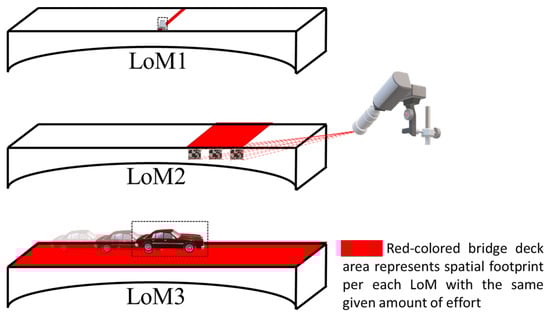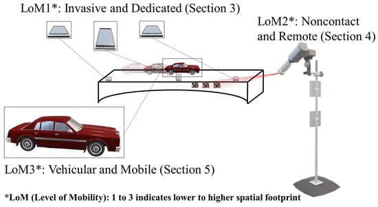 Parallel with the key advances expressed above, in the forthcoming sections, the advances in smartphone-based SHM, with a particular emphasis on bridge infrastructure are categorized into three segments according to the Level of Mobility (LoM): LoM1, invasive smartphone sensing via dedicated sensor positioning; LoM2, computer vision-based smartphone sensing via remote and noncontact monitoring; and LoM3, drive-by smartphone sensing via indirect vehicular monitoring. Accordingly, Section 3, Section 4 and Section 5 address LoM1, LoM2, and LoM3, respectively. Figure 2 conceptually presents LoMs, and Figure 3 indicates their spatial reach. LoMs and their key characteristics are summarized in Table 1.