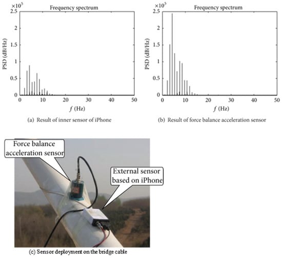 Bridge cable installation of smartphone sensor: smartphone vibration frequency comparisons with the reference data (a,b) and sensor configuration (c), Yu et al. (2015) [32].