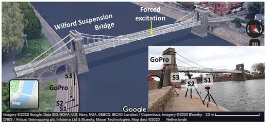 The Wilford Suspension Bridge is a 69 m-long pedestrian and aqueduct bridge crossing the River Trent. It is located in Nottingham, the UK. Studies were carried out to estimate its dynamic properties using smartphone cameras [80] and GNSS [114,115]. In this study, a video dataset from a smartphone, in which vibrations of the bridge are induced by the synchronized jumping of students at the center of its midspan, is analyzed. The aim is to estimate the first vertical vibration frequency and its corresponding mode shape of the bridge. Figure 8 shows the bridge and locations of the CV-based measurement system. A 4k 30 fps video recorded with Smartphone S1 (Samsung Galaxy S9+) is used. It can be noticed that three more devices (one GoPro, and two more smartphones: Smartphone S2 and S3) are positioned near the bridge. For brevity, observations from these measurements are omitted in this case study. The field of view (FoV) of S1 is very similar to the photo showing camera locations in Figure 8.