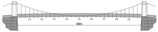 A sketch of the Wilford Suspension bridge with the locations of targets (T, where ).