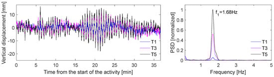 Vertical displacement time-history for the selected activity (left) and power spectrum density plot (right).