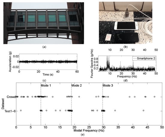 (a) Mudd–Schapiro Bridge, (b) accelerometer instrumentation, (c) sample smartphone measurement, (d) its frequency spectrum, and (e) and the comparison of crowdsourcing-identified modal frequency values with reference tests [34].