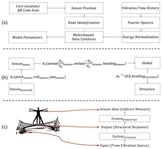 Figure 13 presents how each mitigation measure contributes to the accuracy of spectral features. In Figure 13a, the authors propose an energy-to-power conversion scheme for treating the spatiotemporally irregular vibration data collected from smartphones [55]. Another expected uncertainty due to the uncontrolled sensing environment is sensor orientation changes and errors. Figure 13b proposes a framework to recover distorted vibration signals in the correct alignment with the help of magnetometer, gyroscope, and accelerometer data fusion [56]. Finally, indirect sensing media are the standard concerns in smartphone-based SHM. Figure 13c addresses the indirectness problem using a transfer function development scheme that learns the vibratory features of intermediate bodies to subtract them from the indirect signals and retrieve bridge features [57]. Finally, Table 3 classifies a few benchmark metrics showing the identification challenges addressed in the studies, main impacts, and signature problems that need further attention to achieve improvements in the results.