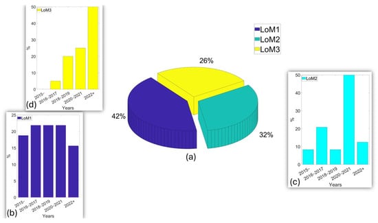 (a) Overall distribution of smartphone-based bridge monitoring sample studies according to their LoM context; (b–d) yearly publication trends among LoM1, LoM2, and LoM3, respectively.
