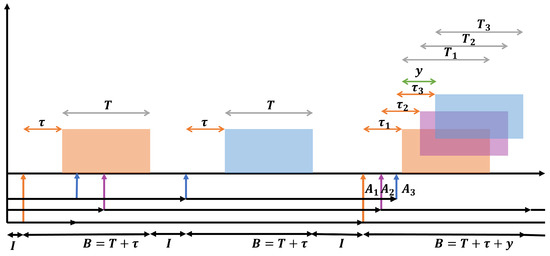 Where the function represents the number of arrivals in the period (0,t). Note that interfering nodes transmit before y; then, the non-interfering nodes have to transmit after , since they no longer collide with the rest of the packets. In this sense, this probability highly depends on the number of interfering nodes, , because as the number of interfering nodes increases, the number of nodes that do not interfere decreases. This is the main issue in the finite population model that the finite population model cannot consider. As such, if there is only one interfering node, , and considering that the first node that transmits is not an interfering node, then