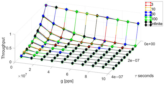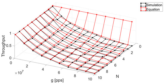 In this section, we present the most relevant results derived from this work. In addition to the analysis developed above, we performed multiple system simulations to validate the analytical results, for both the exact and approximated throughput expressions. We first obtain the system throughput using Equation (13) and compare it to the results under the infinite population model; this infinite model considers that the packet arrival rate remains constant. Conversely, in our proposed model, the rate of packet transmissions decreases according to the number of packets previously transmitted, which renders different, more accurate results for low values of N. In Figure 2, we show the throughput for different values of N for the finite population model, varying the arrival rate (g) from to packets per second (pps) and the vulnerability time () from , taking the speed of light in a vacuum and considering a distance between the sender and receiver of 10 m, to [seconds] (100 m), the T value is fixed to . We can see that the FP model differs greatly from the infinite population model when N is low and when the packet arrival rate is low, i.e., for low values of g and . Note that the infinite population model provides a very good approximation to the system dynamics when the traffic load remains relatively constant during the vulnerability period. This occurs for high values of g and , but for many IoT applications where packet transmissions are scarce, our proposed model better captures the behavior of the system.