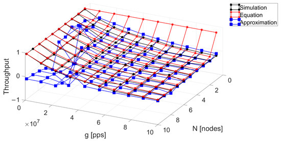And finally, we derived the throughput equation presented in Equation (13). This equation is solved with a closed-form solution, which renders exact results but with high computational complexity that rapidly increases as the number of nodes in the system N increases. As such, we propose an approximated solution as we now describe.