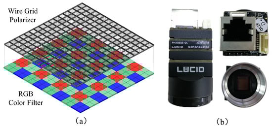 Polarization sensor structure. (a) An illustration of the polarization filter and Bayer filter distribution for the DoFP sensor. (b) The color polarization sensor used for the dataset acquisition in this paper.
