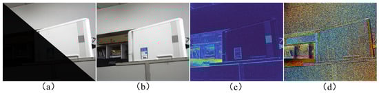 In recent years, there have been many studies related to low-light image enhancement; however, there are currently no studies that can guarantee low-light image enhancement while realizing a distortion-free resolution of polarization information for special polarization sensor structures. The most straightforward approach to enhance low-light images is to linearly amplify each pixel. A typical example is shown in Figure 2, where it can be seen that although the method results in an increase in S0 brightness, at the same time, the noise is amplified. Moreover, due to the amplification of the intensity of image noise, the polarization image (DoLP, AoP) noise, which is then solved by the nonlinear operation, is even more amplified. Figure 3 shows an example of the effect of noise; in the first row, we simulate a non-polarized environment, i.e., the pixel value for acquiring the DoLP is 0. In the second line, we simulate the introduction of a small amount of Gaussian noise () into the camera component, and it can be seen that the DoLP at this point has a large value of DoLP in the regions of the image with low intensity. This shows that a weak noise can present a large number of errors in DoLP images. Therefore, it is essential for our method to consider the effect of noise.