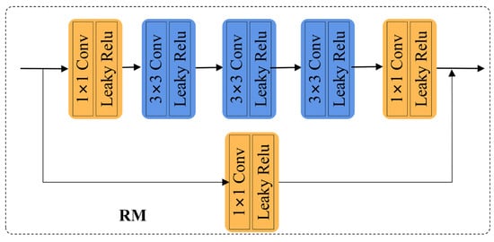 As shown in the first branch of Figure 4 for the intensity network, we feed the mosaiced RGB image, as well as the polarized light intensity images in the four polarization directions of 0°, 45°, 90°, and 135° into this network to enhance the intensity image. Inspired by the literature [26], our network architecture consists of three main components. First, the low-light image is decomposed into an illuminance map and a reflectance map by three convolutional layers; then, the decomposed image is used as input, and the noise in the reflectance map is suppressed by using the illuminance map as a constraint through six convolutional layers to realize the denoising purpose. Finally, the illuminance map obtained in the first part along with the reflectance map obtained in the second part are fed to the DRM module, through which the detail reconstruction module is finally used to obtain the ortho-light image with better visual quality. Due to the special jump connection structure of residual networks, it can make deep neural networks easier to optimize in the training phase without causing gradient vanishing or explosion. Therefore, inspired by the literature [27], we used multiple residual modules (RMs) in the network to obtain better decomposition and denoising results. The specific structure of the RM module is shown in Figure 5, where each RM contains five convolutional layers with convolutional kernel sizes of 1, 3, 3, 3, and 1, respectively. We added a 64 × 1 × 1 convolutional layer at the shortcut connection. Each RM has a 64 × 3 × 3 convolutional layer before and after it. Due to some of the correlation between our four polarized intensity images and the RGB images, we chose to process the correlation channels jointly. In addition, our ultimate goal was to achieve high-quality polarization imaging, so we added the intensity network-enhanced RGB images and the four polarization intensity images into the polarization information complementary network (PCN), which further ensured high-quality, high-fidelity imaging of the polarization images by means of Stokes vectors.