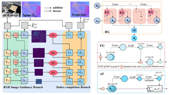 As shown in Figure 6, our PCN network is a Stokes vector complementary network, and the overall structure contains two hourglass network branches, i.e., the RGB image guidance branch and the polarization Stokes vector complementary branch. The inputs of the network are the high-quality RGB images output from the intensity network and the sparse Stokes components S1,2 after enhancement, and the output of the network is the complementary full-resolution dense S1,2.