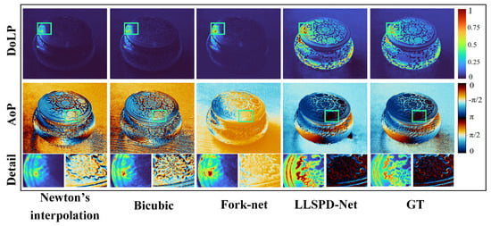 In order to reduce the noise of polarization imaging, we discard the traditional interpolation idea, but draw on the idea of deep completion, and use the end-to-end mapping of deep learning models to directly complement the Stokes vector for polarization imaging. Therefore, we use the LLSPD-Net Part I intensity network-enhanced intensity images with different polarization directions as source images, and compare them with several existing typical polarization demosaicing (PDM) models. Among them, Newton’s [20] and bicubic [34] interpolations are traditional methods, while ForkNet [21] is a deep learning method. The comparison results in Figure 9 evidently show that Newton’s interpolation can effectively enhance the edge profile information of DoLP and AoP, and is very sensitive to the gradient information, but the method introduces artifacts, the distortion of polarized images, and is accompanied by certain meshing results. Bicubic, on the other hand, can guarantee the gradient information of polarized images, but the method introduces serious noise, which is particularly noticeable in AoP images. Compared to the above two traditional methods, ForkNet has some advantages in noise suppression, but the AoP images generated by this method have significant distortion. In conclusion, compared to the above methods, LLSPD-Net has better stability for polarization gradient characterization with less noise and higher contrast.