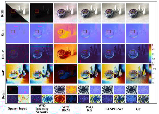In order to verify the effect of each component in LLSPD−Net on the whole model, we performed ablation experiments. First, we removed the intensity network, as shown in Figure 10. It can be seen that without the enhancement of the low-illumination source image, the polarized image produced severe noise, which was caused by the lack of a high-quality RGB bootstrap image, resulting in artifacts in the complementary S1,2. In order to further explore the visual effect of the detail reconstruction module (DRM) in the intensity network for the enhancement of low-light images and the effect of polarization preservation, we removed the DRM module in the intensity network, as shown in Figure 10. Due to the module lacking in detail preservation and color correction, the enhanced RGB image produced color distortions. At the same time, from the solved Stokes vectors, i.e., the AoP and the DoLP images, it can be seen that the polarization information is seriously lost, and the polarization information generated is very far away from the GT, i.e., it generates polarization distortions. In addition, in order to explore the role of the repeat guidance (RG) module for the network in a polarization complementary network (PCN), we removed the module, and the results show that the generated polarized images are monotonically smoothed, which introduces less noise but loses the detailed information such as edges, gradients, etc., of the AoP and DoLP images.