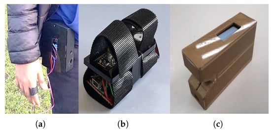 The sensor prototype development timeline [24]. (a) Alpha version of the sensor using Velcro tape and bulky 3D case; (b) beta version of the sensor; (c) the final version of the sensor with 0.91-inch OLED display and remote monitoring capacity.