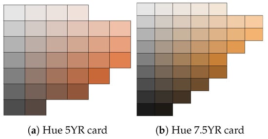 - Munsell Color System; Color Matching from Munsell Color Company. Munsell Color Notation and Color Test; Dimensions of Color Munsell Color System. 2022. Available online: https://munsell.com/about-munsell-color/how-color-notation-works (accessed on 4 July 2022).