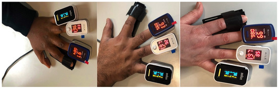 We took a total of 600 SpO2 measurements from 20 volunteers, including measurements from each of the 10 different fingertips from both left and right hands (Figure 6). None of the volunteers used nail polish. The measurements were obtained using the UK NHS-approved pulse oximeters Acurio [56], Braun [57], and Ailie [58], which are all fingertip sensors.