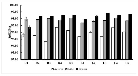 After performing the repeated ANOVA test (Table 3, Table 4 and Table 5), we noticed that there was no significant difference in measuring SpO2 from different fingers. Post hoc analyses on the 45 comparisons, showed no significant difference between the commercial sensors (Ailie, Acurio, and Braun), as shown in the tables. We further constructed a bar chart with error bars to show the performance of the 10 fingertips, as shown in Figure 7.