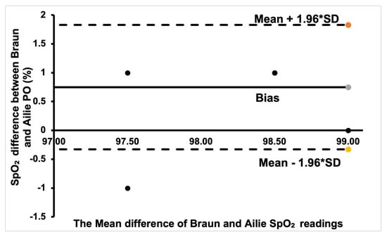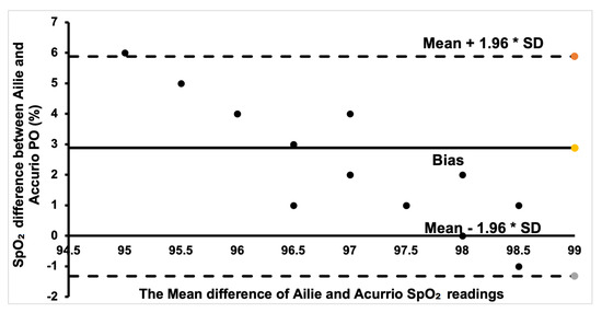 The Bland–Altman plot for the Ailie and Acurrio devices in Figure 8 shows a good degree of agreement, with only one outlier value seen outside the limits of agreement. The corresponding data point rallies around the bias point, hence a good degree of agreement is established. Hence, there is no clinically significant difference in the SpO2 readings from the two sensors. For the Braun and Ailie POs, the degree of agreement is also strong, as most data points are within the upper and lower limits of agreement, as shown in Figure 9. Hence, there is no clinically significant difference in the SpO2 readings between the two sensors.