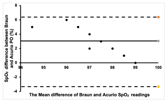 Finally, for the Braun and Acurio pair, shown in Figure 10, a good portion of the readings was within the positive bias. A few data points that are far from the bias points denote a weak agreement, with only one point being outside the lower limit of agreement. Therefore, there is no clinical difference in measuring SpO2 between the two commercial sensors.