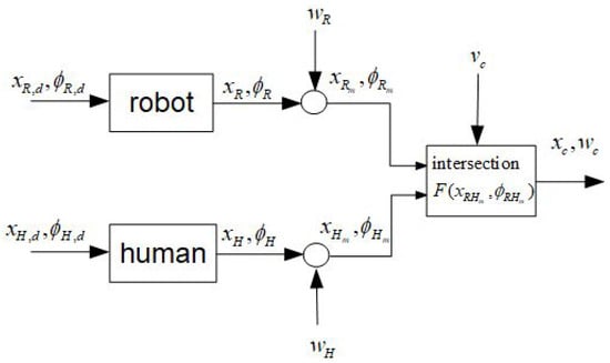 The positions and orientations of robots and humans are usually corrupted with noise originated from system uncertainties, sensor errors and motor characteristics. These uncertainties become apparent in uncertainties in the crossing/intersection areas of the trajectories of the robot and human. The analysis of uncertainty and noise at generated by the noise at , and requires a linearization of (4) around the operating points and with this a differential strategy. Let, for simplification, only the orientation angles and be corrupted with noise. In Section 4.3, the positions are taken into account, too.