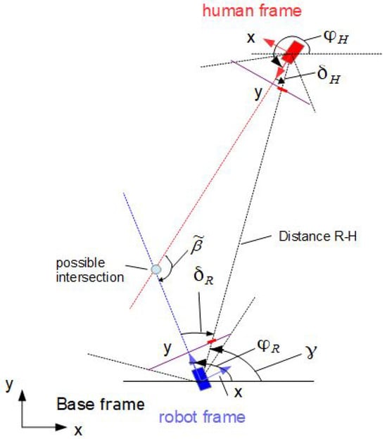 where and are the positions of the human and robot and and are their orientation angles, and and are the positive angles measured from the y coordinates counterclockwise. The angle at the intersection is . The variables , , , and ; distance ; and angle are assumed to be measurable. Angle is a bearing angle for the robot-to-human direction measured in base coordinates. If is not directly measurable, then it can be computed by