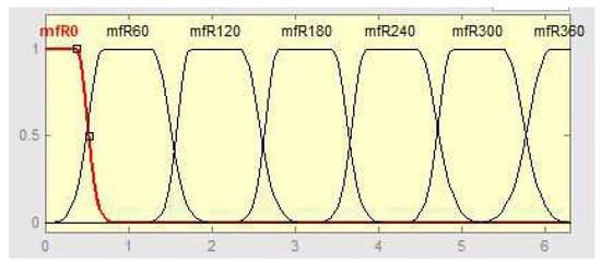 Let the universes of discourse for and be . Furthermore, let these universes of discourse be divided into n partitions (for example, 6) of 60, which leads to fuzzy rules. The corresponding membership functions are shown in Figure 3. It turns out that this resolution leads to a poor fuzzy approximation. The approximation quality can be improved by increasing the number of fuzzy sets, which however results in a quadratic increase in the number of fuzzy rules. To avoid an “explosion” of the number of fuzzy rules being computed in one time step, a set of sub-areas covering a small number of rules for each sub-area is defined. Based on the measurements of and , the appropriate sub-area is selected together with a corresponding set of rules (see Figure 4, sub-area ). With this, the number of rules to be activated at one time step of calculation is low, although the total number of rules can be high. At the borderlines between the sub-areas, abrupt changes may occur, which can be avoided by overlapping the sub-areas.