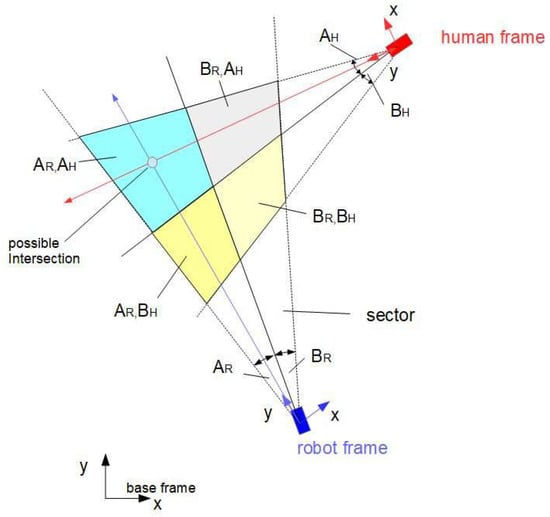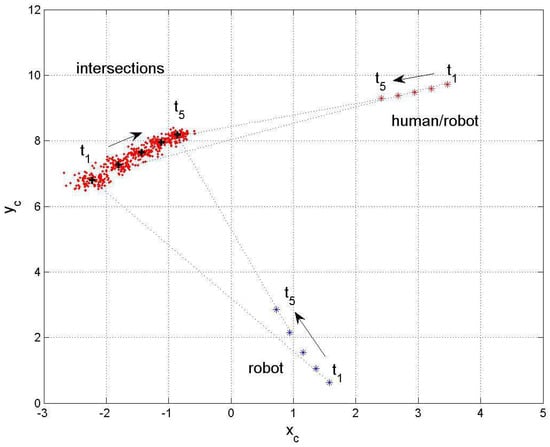 The planning and performing of mobile robot tasks in the presence of human operators while sharing the same workspace requires a high level of stability and safety. Research activities regarding navigation, obstacle avoidance, adaptation and collaboration between robots and human agents have been widely reported [,]. Multiple target tracking for robots using higher control levels in a control hierarchy are discussed in [,]. A human-friendly interaction between robots and humans can be obtained by human-like sensor systems []. A prominent role in robot navigation is the trajectory-crossing problem of robots and humans [,] and corresponding fuzzy solutions []. Motivations for a fuzzy solution of the intersection problem are manifold. One point is an uncertain measurement of the position and orientation of the human agent, because of which the use of a fuzzy signal and an adequate fuzzy processing seems natural [,]. Another aspect is the need for decreasing the computing effort in the case of complex calculations during a very small time interval. System uncertainties and observation noise lead to uncertainties of the intersection estimations.