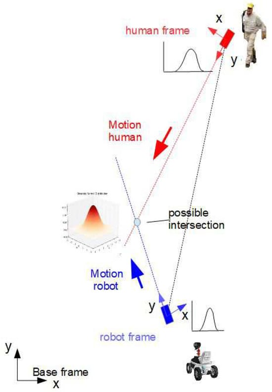 In this connection, uncertainties and noise on the random variables’ position/orientation , , and of the robot and human have a great impact on the calculation of the expected intersection position . The random variable is calculated as the crossing point of the extension of the orientation or velocity vectors of the robot and human, which may change during motion depending on the task and current interaction. The task is to calculate the intersection and its uncertainty in the presence of the known uncertainties of the acting agent robot and human.