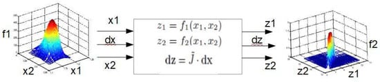on the condition that exists. Then, the covariance matrix is defined in correspondence to the required variances and . The following steps correspond to Equations (34)–(42). The position vector is assumed to be known. The inversion of requires a linearization of and a starting point to obtain a stable convergence to the inverse . The result is the mean and the covariance at the input. A reliable inversion is only possible for the 2-input–2-output case.