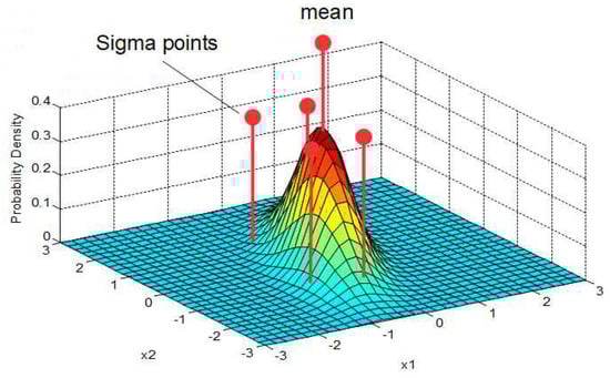 - The sigma-point transformation, which calculates the so-called sigma points of the input distribution, including the mean and covariance of the input. The sigma points are directly propagated through the nonlinear system [,,] to obtain the means and covariance of the output and, with this, the standard deviations of the output (the position of intersection). The advantage of the sigma-point transformation is that it captures the first- and second-order statistics of a random variable, whereas the statistical linearization approximates a random variable only by its first order. However, the computational complexity of the extended Kalman filter (EKF, differential approach) and unscented Kalman filter (UKF, sigma-point approach) is of the same order [].