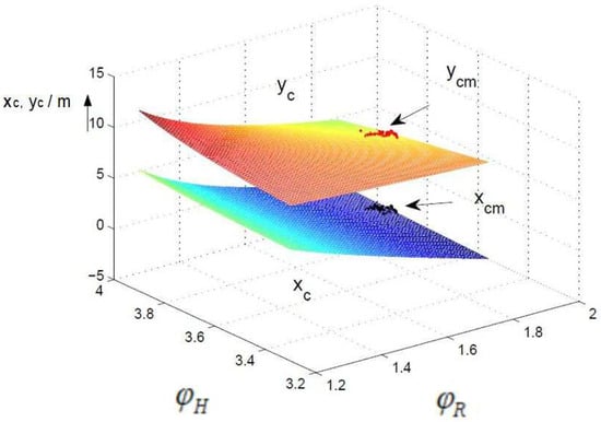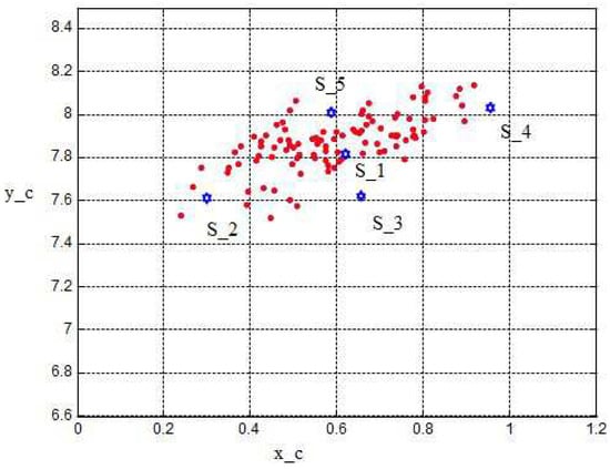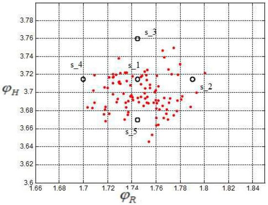 A view at the sigma points presents the following results: Figure 11 shows the two-dimensional distribution of the orientation angles , and the corresponding sigma points where denotes the mean value. Figure 12 shows the two-dimensional distribution of the intersection coordinates with the sigma points . denotes the mean value and are distributed in such a way that the are transformed into , . From both figures, an optimal selection of both and can be observed, which results in a good match of the computed and measured standard deviations .