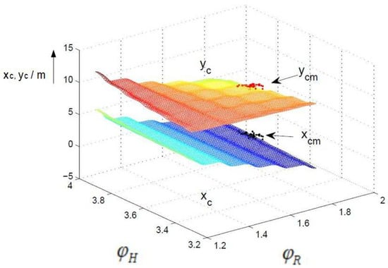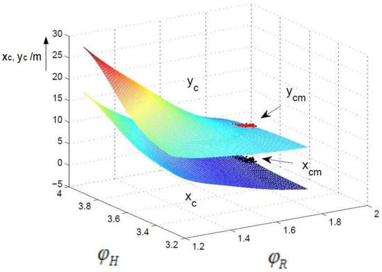 In the following, the estimation/identification of the standard deviations of possible intersection coordinates of trajectories for both the robot–robot and human–robot combinations by means of the sigma-point technique is discussed. The following method is based on the unscented Kalman filter technique where the intersections cannot be directly measured but predicted/computed only. Nevertheless, it is possible to compute the variance of the predicted events, such as possible collisions or planned rendezvous situations, by a direct propagation of statistical parameters—the sigma points—through the nonlinear geometrical relation, which is a result of the crossing of two trajectories. Let —the input vector and —the output vector where for the special case and . The nonlinear relation between and is given by (34)