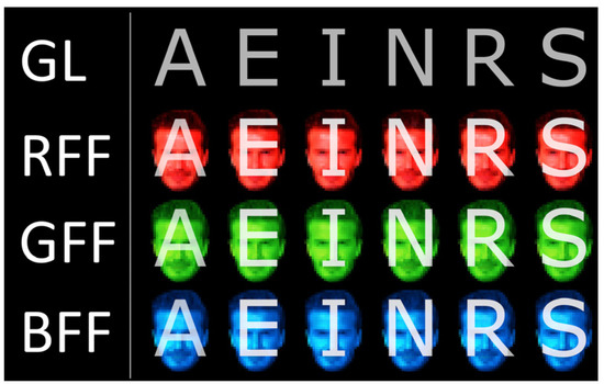 In this study, four different RSVP paradigms have been assessed, each distinguished by the type of stimulus employed in accordance with those used by Li et al. [21]: (i) grey letters (GL), (ii) semi-transparent grey letters with a red famous face (RFF), (iii) semi-transparent grey letters with a green famous face (GFF), and (iv) semi-transparent grey letters with a blue famous face (BFF) (Figure 1). Each paradigm displayed six distinct letters (A, E, I, N, R, and S, in Arial font), which were utilised for word formation during the experiment. This specific number of letters was chosen to ensure that the target selection time remained manageable, as the primary goal was to validate these diverse sets of stimuli for communication purposes within the RSVP framework. These letters were deliberately selected to facilitate both calibration and real-time writing tasks, aligning with prior studies that employed a similar number of elements to test hypotheses [17,22]. As a stimulus, the famous face of David Beckham was utilised, a choice consistent with previous studies [20]. The dimensions of the stimuli were standardised, with letters measuring approximately 6 × 6 cm (using the letter “N” as a reference) and faces spanning around 6 × 8 cm. The interface background was set to black, and the stimuli were presented centrally on the screen. Additionally, at the top of the screen, both the letters available for selection and those already chosen were indicated. Each stimulus was centrally displayed on the screen for 187.5 ms, with an inter-stimuli interval (ISI) of 93.75 ms, resulting in a stimulus onset asynchrony (SOA) lasting 281.25 ms. The time taken to complete a sequence (comprising the presentation of each stimulus) was 1687.5 ms. Each trial consisted of several sequences (fixed at 10 in the calibration task and variable in the online task, as explained in Section 2.4). Therefore, the flashing of stimuli lasted 1687.5 ms multiplied by the number of sequences used. Before starting a trial, there was a pause of 4000 ms, as well as another pause of 875 ms at the end of it. Thus, between one selection and the commencement of the next (i.e., between completed sets of sequences) there was a total pause of 4875 ms.