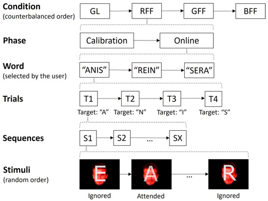 A within-subject design was used, ensuring that all participants experienced all experimental conditions (Figure 2). The entire session lasted approximately 90 min. To prevent potential biases like learning or fatigue, the order of the paradigms was counterbalanced among the participants. Each condition comprised two BCI tasks: (i) an initial calibration phase aimed at capturing the user-specific signal patterns, during which no feedback was provided, and (ii) an online phase, where participants actively controlled the interface. Both phases involved the task of composing four-letter French words. Finally, in a subjective questionnaire phase, the participants were required to respond to items related to their opinion regarding the control experience during the just-completed condition. In the calibration phase, the participants wrote four words (“ASIE”, “REIN”, “NIER”, and “SAIN”), totalling 16 letter selections. In the online phase, participants were required to write three different words chosen freely (although the following four were suggested: “ANIS”, “AIRE”, “REIN”, and “SERA”), resulting in 12 letter selections. The participant had to indicate before starting the writing which word they wanted to spell out. In the event of an erroneous letter selection during the online phase, the participant proceeded to the next letter. There were short breaks between words in both phases, with the duration varying based on the participant’s preference. During the calibration phase, the number of sequences, representing how frequently each stimulus was presented, was fixed at 10. Conversely, for the online phase, the number of sequences employed for character selection corresponded to the instance in which the participant achieved the second-highest consecutive accuracy results in the calibration task. In instances where the maximum accuracy was not repeated consecutively or only occurred once, the first-best sequence was chosen.