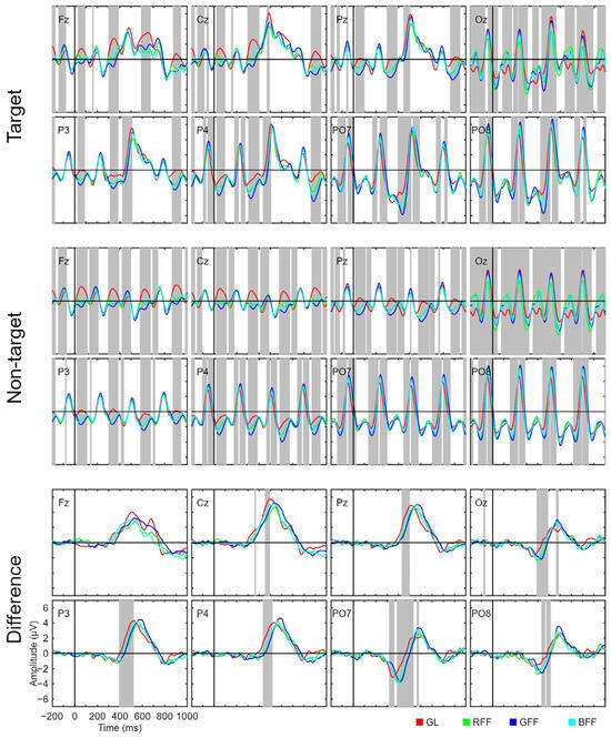 Grand average event-related potential waveforms for the target and non-target stimulus signals, and the amplitude differences between them for all channels used (Fz, Cz, Pz, Oz, P3, P4, PO7, and PO8) and for the four conditions (grey letters, GL; red famous face with letter, RFF; green famous face with letter, GFF; and blue famous face with letter, BFF). Significant intervals are denoted with a grey background on the time axis. The false discovery rate (FDR) correction method was applied.