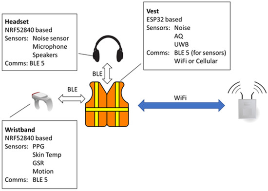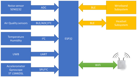 We have followed the architecture for smart garment subsystems, including components, sensors, communication devices, and computational needs, as shown in the high-level diagram of Figure 1. This can be described as a hierarchical architecture with the following components: a number of sensing devices carrying a multitude of sensors (headset, wristband, and/or AQ nodes), connected through low-power wireless BLE interfaces to a central “smart garment hub” placed on the vest. The latter is responsible for gathering the information from the devices, gathering additional information through sensors integrated into the hub itself, processing the data, and communicating with the backbone through a standard Wi-Fi interface.