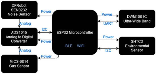 The smart garment hub consists of the following components: the ultra-wideband (UWB) component [9] that provides indoor localization; the sensors component, which includes the noise level sensor DFRobot SEN0232, the air quality sensor MiCS-6814 (CO, NH3, NO2), and the environmental sensor SHTC3 (temperature, humidity); and the main microcontroller unit (MCU) that provides the local processing unit and interfaces with peripheral systems. The latter is also responsible for communicating with the backbone through a Wi-Fi interface. After conducting in-lab measurements of the total power consumption of the smart garment hub, a 2500 mAh lithium polymer rechargeable battery was chosen for the power supply in order to achieve the desired autonomy of a 12-h working shift. The architecture of the smart garment hub is illustrated in Figure 2, while Figure 3 summarizes the different interfaces used for communicating with the various components.