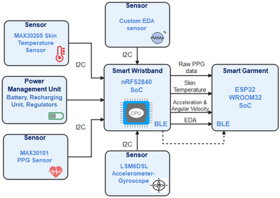 The assessment of mine workers’ health state by monitoring essential vital signs, such as heart rate, oxygen saturation level, sweat, and body temperature, is an essential and required functionality of the smart garment. To achieve that, the development of a miniaturized, reliable, and long-life smart wristband has been completed. The architecture of the wristband is presented in Figure 4.