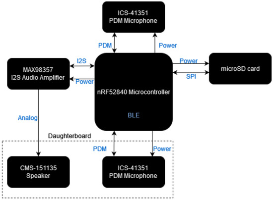 The smart earplugs are responsible for measuring the exposure of the mine workers to excessive noise levels while also providing an audio chatbot. Their high-level architecture is presented in Figure 5. It consists of (a) a main module mounted on the outer side of the protective earmuffs, containing the microcontroller unit, which is responsible for communicating with the smart garment hub; a microSD card, which holds the audio files; an audio amplifier for the speaker; a microphone for capturing the keywords, while also measuring the noise level outside of the protective earmuffs; a lithium polymer for power supply; and (b) a daughterboard module mounted on the inner side of the protective earmuffs, containing a microphone for measuring the noise level which passes from the protective earmuffs; and a speaker for audio feedback to the user.