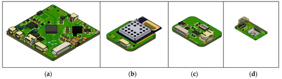 PCB 3D layouts: (a) Microcontroller unit, (b) Ultra-wideband module, (c) Sensor module, (d) Battery charger and switch.