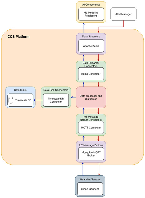 The architecture of the alert notification mechanism for the smart garment is displayed in Figure 17. The alert is transmitted via a Kafka broker. The notification from the Kafka broker is transmitted via the MQTT protocol to the smart garment vest access point device. This device transmits the alert message via the BLE protocol to the earplugs device in order to play the predefined sound file and notify the end user. Through a series of tests, we have confirmed that the earplugs, the vest, and the IIoT platform are working as expected, and an alert can be transmitted to the end user.