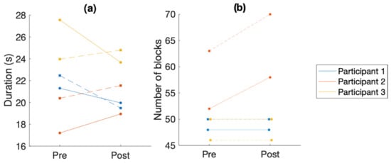 The results show a significant improvement in overall performance in the NHPT for participants 1 and 3 (see Figure 1a). For participant 3, the performance of the right hand in the NHPT significantly improved, while the performance of the left hand slightly deteriorated. Participant 2’s performance deteriorated. This also corresponds to the significant increase in MDS-UPDRS ratings for participant 2 (from an overall rating of 5 to an overall rating of 10 in the movement-related items measured in this experiment).