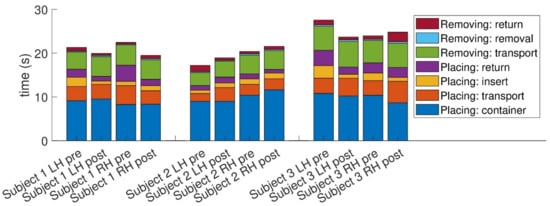 As we used an instrumented version of the NHPT, we were able to decompose the total time taken into its components. First, we divided the total time into the time taken to place the pegs and the time to return the pegs to the receptacle. During placing, there is the container (time to take the peg from the container), transport (moving the hand from the receptacle to starting to insert the peg), insert (inserting the peg in the hole), and return (returning the hand to the receptacle). Removing is deconstructed into transport (taking the hand from the receptacle to the peg), removal (removing the peg from the hole), and return (returning the peg to the receptacle).