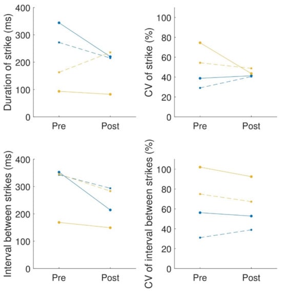 We captured and analyzed four metrics: the mean and coefficient of variation (CV) of strike duration, as well as the mean and CV of the interval between strikes. Collectively, these measures function as indicators of the speed and consistency of finger movements.