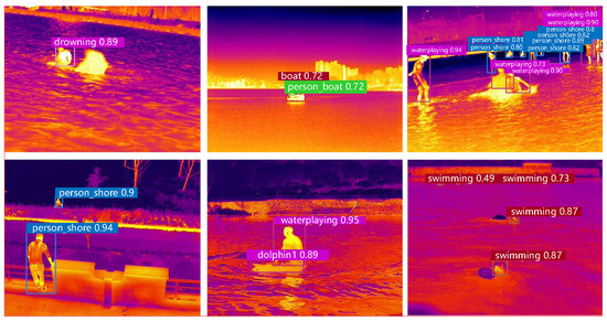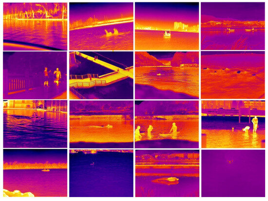 The thermal imaging dataset for water objects comprises 4186 thermal images. Tailored to specific requirements, it categorizes into eight distinct classes: people drowning (drowning), people playing in the water (waterplaying), individuals being rescued by unmanned vessels (waterhelping), swimming (swimming), people on the shore (person_shore), people on board (person_boat), boats (boat), and the lifesaving robot “Dolphin I” (dolphin I). This dataset spans a variety of scenes including natural waters, coastlines, and artificial lake parks, ensuring a rich and diverse data collection. Additionally, the IR-YZ dataset features objects of varying sizes, ranging from small objects less than 10 × 10 pixels at long distances to larger, close-range objects. The dataset’s structure is detailed in Table 2.