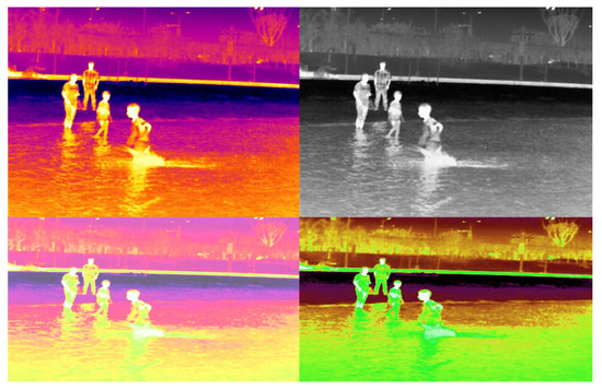 The color gamut transformation data augmentation technique for thermal images adjusts the RGB values of the thermal images or alters their gamma values, saturation, and brightness, among other parameters. The aim of this technique is to enhance the model’s ability to generalize across thermal images processed with various toning methods, as illustrated in Figure 5.