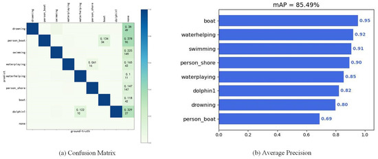 Incorporating Ghost convolution into the model resulted in a modest improvement in inference speed and a reduction in model size, albeit with a longer training duration. The addition of the CBAM effectively enhanced the model accuracy, though it did incur a decrease in the inference speed. The combined application of both enhancements yielded a slight increase in inference speed compared to the addition of the CBAM alone, yet the training time was further extended. Nonetheless, when contrasted with the 81.2 MB YOLOv5m network, the enhanced YOLOv5s model proposed in this study is considerably more compact, at just 13 MB, while maintaining comparable or even slightly superior performance. Consequently, this model was selected for use in our detection tasks. Evaluation of the model on the test sets utilized the mean average precision (mAP) for each category and a confusion matrix, as depicted in Figure 10. The confusion matrix indicates generally strong model performance, with limited misclassifications between categories and the background. The accuracy for most categories exceeds 80% according to the mAP data, with the detection of drowning individuals—critical for intelligent lifesaving missions—being notably effective. Given that individuals drowning tend to be partially submerged and can be considered small objects from a distance, achieving an initial category mAP of 80% underscores the proposed model’s strengths. The lower mAP observed for individuals on board can be attributed to the smaller sample size for this category and the fact that, during data collection, most vessels were positioned mid-river or lake, over 150 m from the shore, leading to the objects on board being significantly small. Future studies will aim to enrich the dataset with additional images of individuals on board.