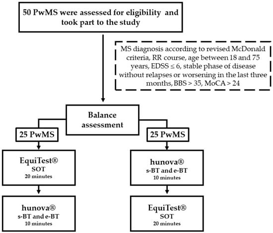 PwMS were enrolled from those followed as outpatients at the AISM Rehabilitation Service of Genoa (Italy). Inclusion criteria were MS diagnosis according to revised McDonald criteria [], age between 18 and 75 years, relapsing-remitting (RR) course, a disability level as measured by the Expanded Disability Status Scale (EDSS) [] ≤6, stable phase of disease without relapses or worsening in the last three months, Berg Balance Score (BBS) [] score > 35 indicating ability to stand upright and walking with at least one support, and normal cognitive functioning as indicated by a Montreal Cognitive Assessment (MoCA) [,] score ≥ 24. We excluded participants with psychiatric disorders, significant visual impairment defined as a Visual System scoring more than 2 at the Functional Systems Score of EDSS, and cardiovascular and/or respiratory disorders. Study procedures and consent forms conformed to the ethical standards of the 2013 revised Declaration of Helsinki and were approved by the regional ethical committee (Comitato Etico Regionale (CER) Liguria, reference number: 36/2022—DB id 12144). All the participants provided written informed consent to participate in the study and to state their agreement with the publication and communication of the results.